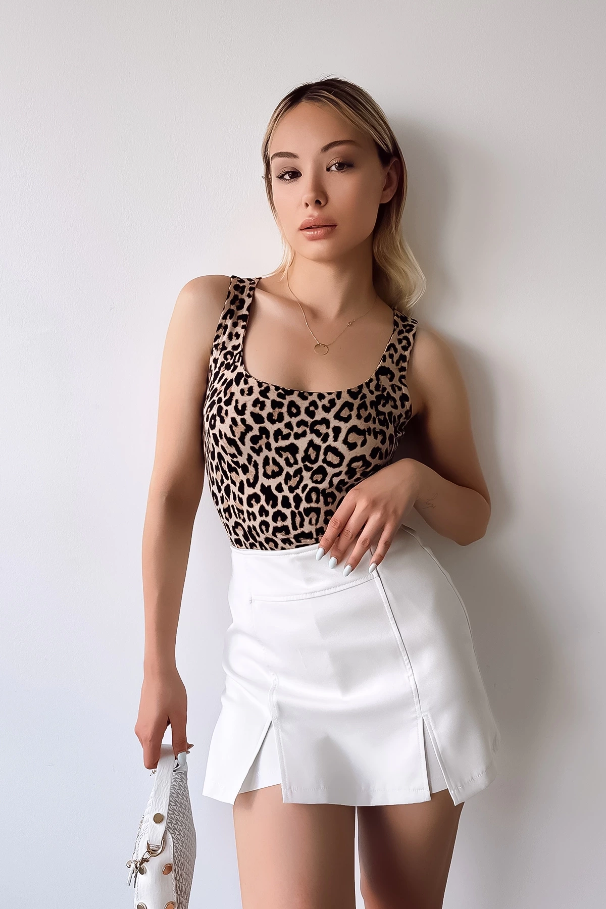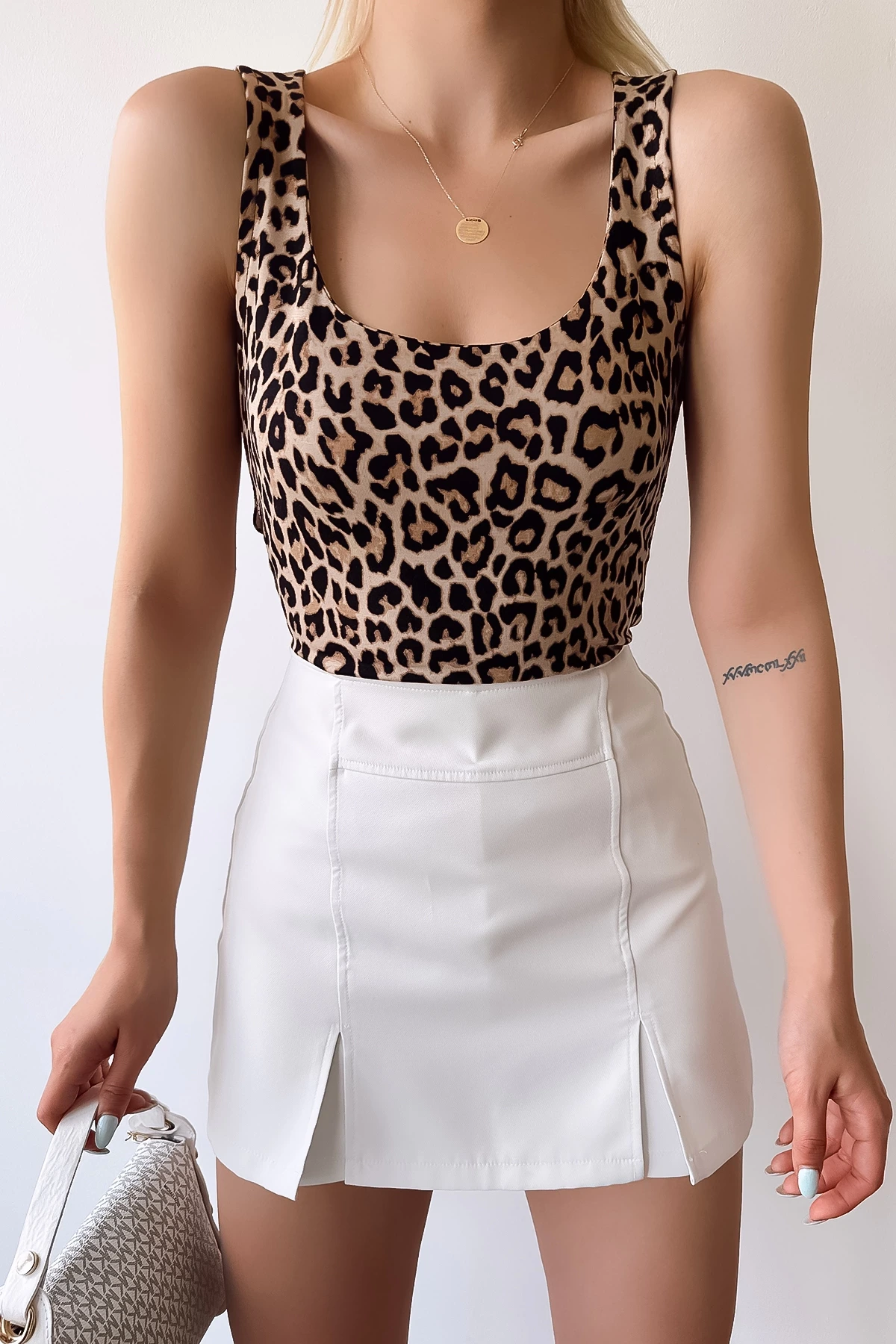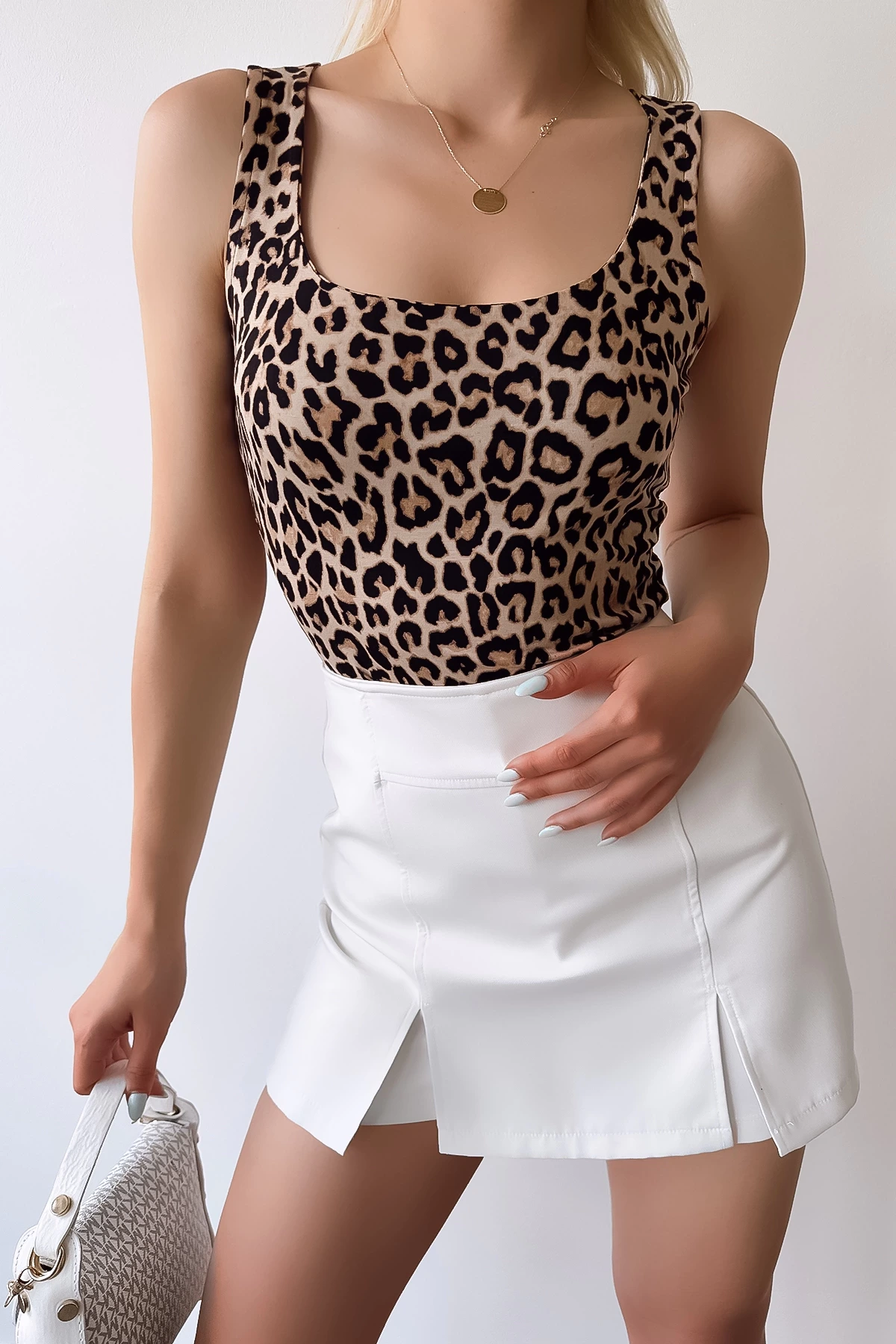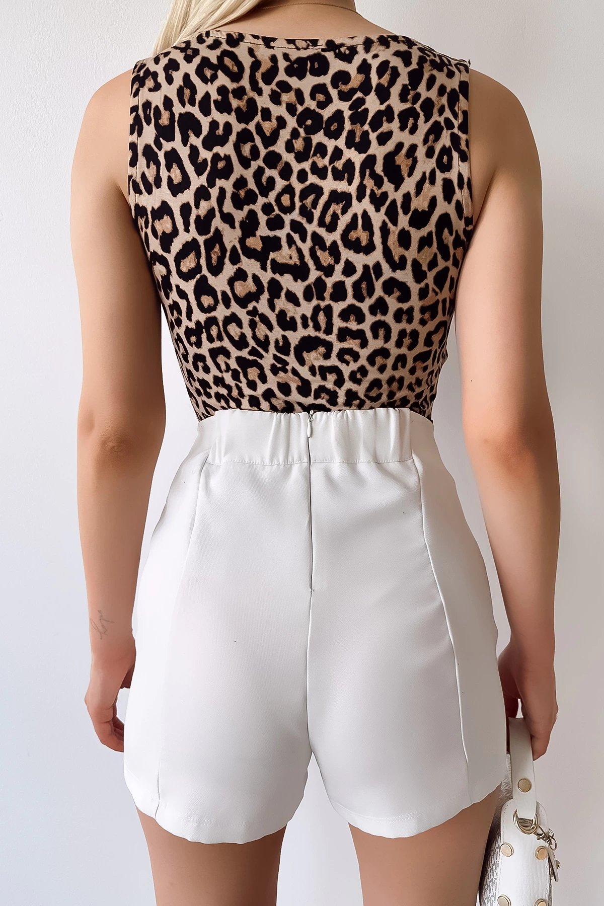 Kadın Sıfır Kol Luxury Bej Leopar Desen Önü Çift Kat Viskon Bluz