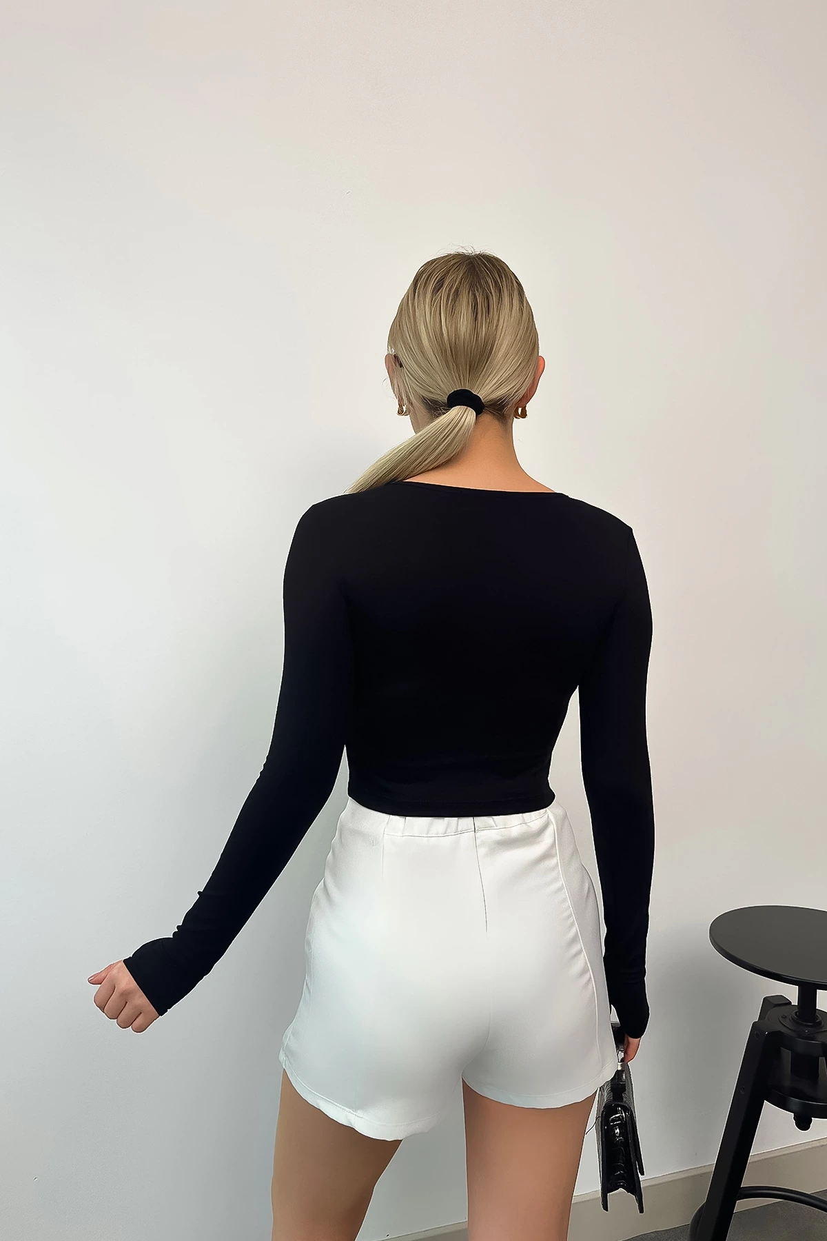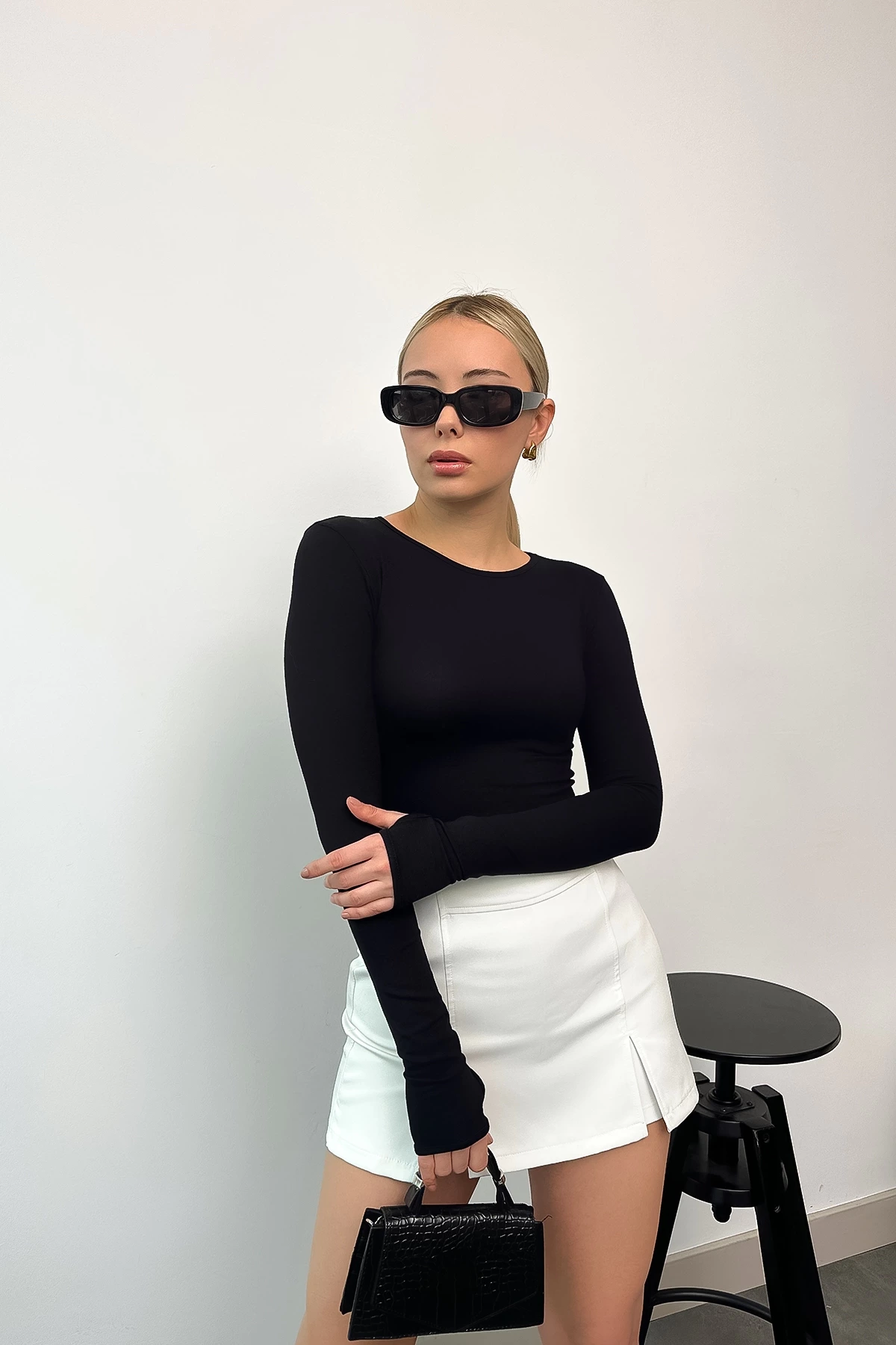 Kadın Siyah Cotton Bisiklet Yaka Parmak Geçmeli Body
